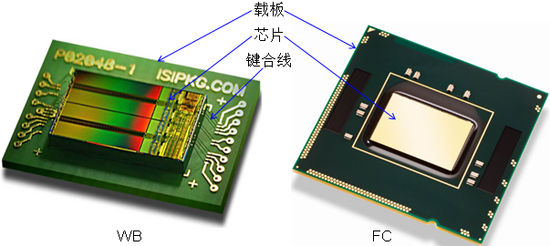 芯片与封装的互联方式常见的主要有两种,Wire Bonding(引线键合)和Flip Chip(倒装芯片),如下图所示。引线键合工艺,需要分两个步骤,一先把芯片粘结在载板上,实现物理连接,第二步才是引线键合,实现电性连接;而倒装芯片则只需一个步骤即可同时实现物理连接和电性连接。