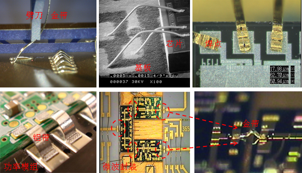 除上述两种常见的键合方式,还有一种带式键合(Ribbon Bonding),其键合过程与Wedge Bonding相似,但材料不是线状,二是带状的,主要有金带和铝带。由于金属带比较宽,可以提供更小的电阻和电感。铝带主要应用在大功率上,金带射频微波器件上,详见下图。其工艺过程,请参考视频。
