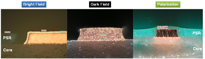 BF/DF/PL/DIC可以让显微镜输出不同的衬度,AS则可以略微改变成像的景深。其中偏振是非常重要的附件,因其有极佳的颜色衬度,特别是对不同种类的有机物可以呈现出不同的颜色,这是明场像,暗场像,甚或是SEM,包括EDX均无法实现的分辨能力。可以这样说,偏振附件对有机污染以及有机异物的观察在某些应用场合是不可替代的。举个例子,在偏振光下,PCB基板表面的绿漆是透明的淡绿色,这意味着不必去掉绿漆,就能看到绿漆下面铜布线的缺陷。暗场虽有类似的效果,但其亮度较低且颜色衬度较差,使其远没有达到偏振的清晰程度。下图给出了明场像,暗场像和偏振像之间的差别,仅供参考[6]。