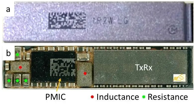 为了一窥目前市面上最新mmWave芯片内部结构细节,泛铨科技(MSS Corp.)此次分析的重点是高通公司(Qualcomm)设计用于苹果(Apple)最新智能型手机iPhone 12的mmWave封装天线( Antenna in package;AiP)模组——QTM 525。该模组是由Apple官方网站所购买的iPhone 12 Pro手机上拆解下来的,外观照片如图1a所示,图1b则为拆解打开外壳后的正面照片。该AiP模组中包含一个发射器/接收器(Tx/Rx)芯片、一个电源管理芯片(PMIC)以及数个被动组件(如电感与电阻),mmWAV天线则与下方芯片载板结合在一起。